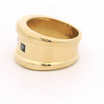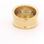 Este anillo tipo tuerca de oro amarillo 18K destaca por su diseño ancho y de líneas limpias, con un estilo moderno que transmite presencia y elegancia. En el centro incorpora una franja con 5 piedras de corte cuadrado (según imagen), combinando 3 piedras azules y 2 diamantes naturales, creando un contraste sofisticado entre el azul profundo y el brillo cristalino.